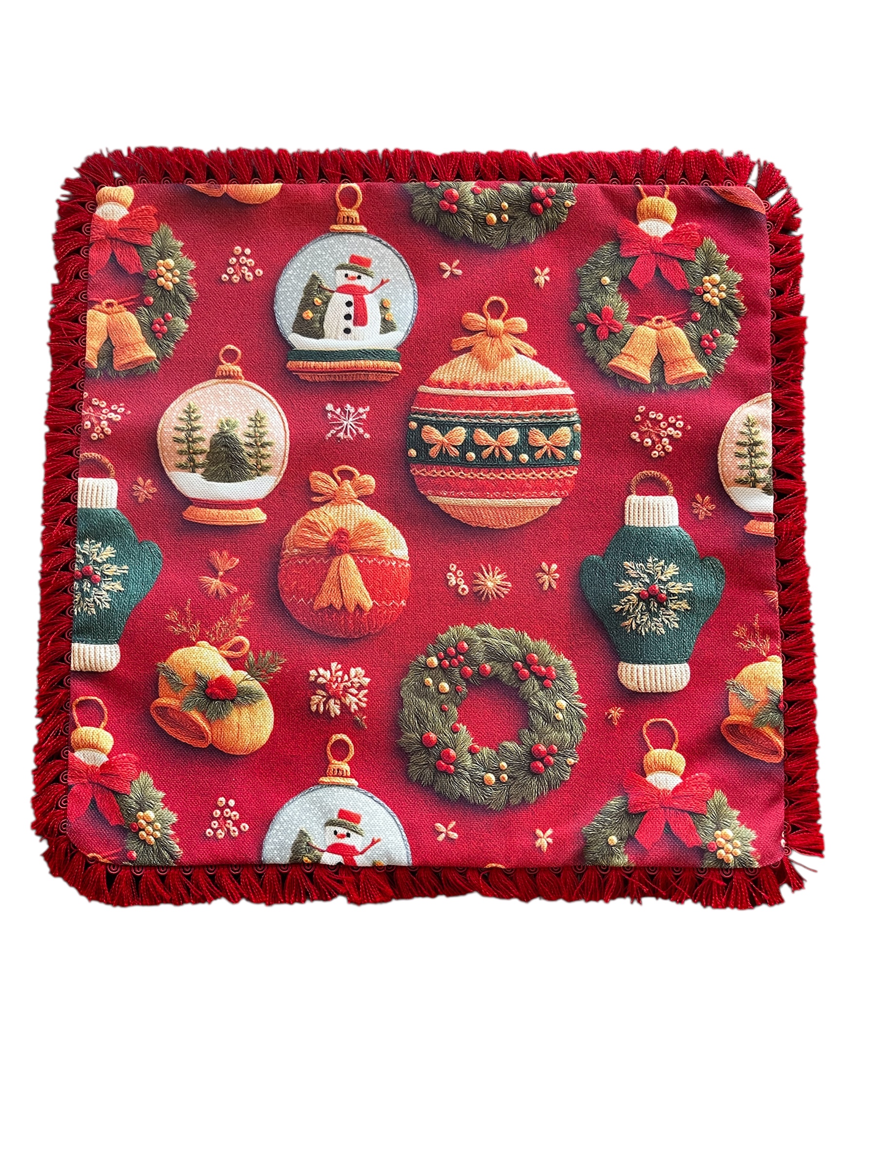40×40 cm boyutlarındaki kare saçaklı şekliyle, yılbaşı dekorasyonunuzun vazgeçilmez bir parçası olacak bir kırlent kılıfıdır.